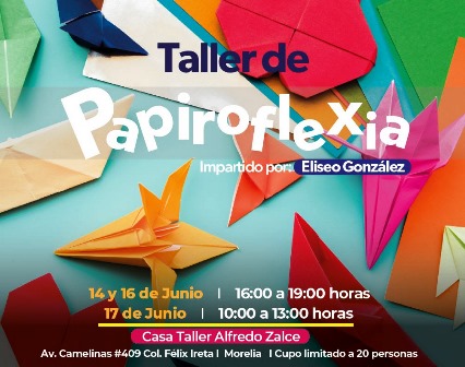 La Secretaría de Cultura de Michoacán (Secum) invita al público en general al taller de Papiroflexia por la liberación, una práctica milenaria japonesa que se impartirá en la Casa Taller Alfredo Zalce, los días 14 y 16 de junio de 16:00 a 19:00 horas, y el sábado 17 de junio de 10:00 a 13:00 horas.