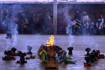 Como es tradición, integrantes del pueblo purépecha agradecen a la madre tierra por las bondades del último ciclo y encomiendan el porvenir de sus pueblos al Fuego Nuevo. Son los cargueros los responsables del cuidado de los símbolos tradicionales y el resguardo de estos, durante toda la ceremonia.