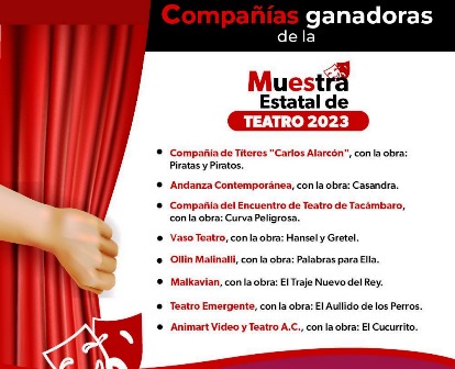 La Secretaría de Cultura de Michoacán (Secum) anunció a las ocho compañías ganadoras de la convocatoria de la Muestra Estatal de Teatro 2023. Estas serán acreedoras a un estímulo económico y conformarán una cartelera teatral a presentarse en el mes de junio.