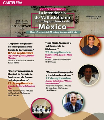 En el marco del mes patrio, la Secretaría de Cultura de Michoacán (Secum) invita a toda la población a disfrutar del ciclo de conferencias “La intendencia de Valladolid en la Independencia de México”, que se realizará los días 7, 13, 22 y 27 de septiembre en el Museo del Estado y en el Museo Casa Natal de Morelos.