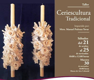 Las 7 sesiones del taller estarán a cargo de Manuel Pedraza Tovar, maestro ceriescultor quien se distingue por el trabajo del rescate, investigación y difusión de la cerería en Michoacán, tanto figurativa como escamada, y quien ha participado en concursos estatales y nacionales en los cuales ha obtenido premios y reconocimientos. Su trabajo se ha expuesto en museos y recintos culturales de Michoacán y de otras partes de la Republica Mexicana. Informes e inscripciones en el correo artecolonialmuseo@gmail.com.