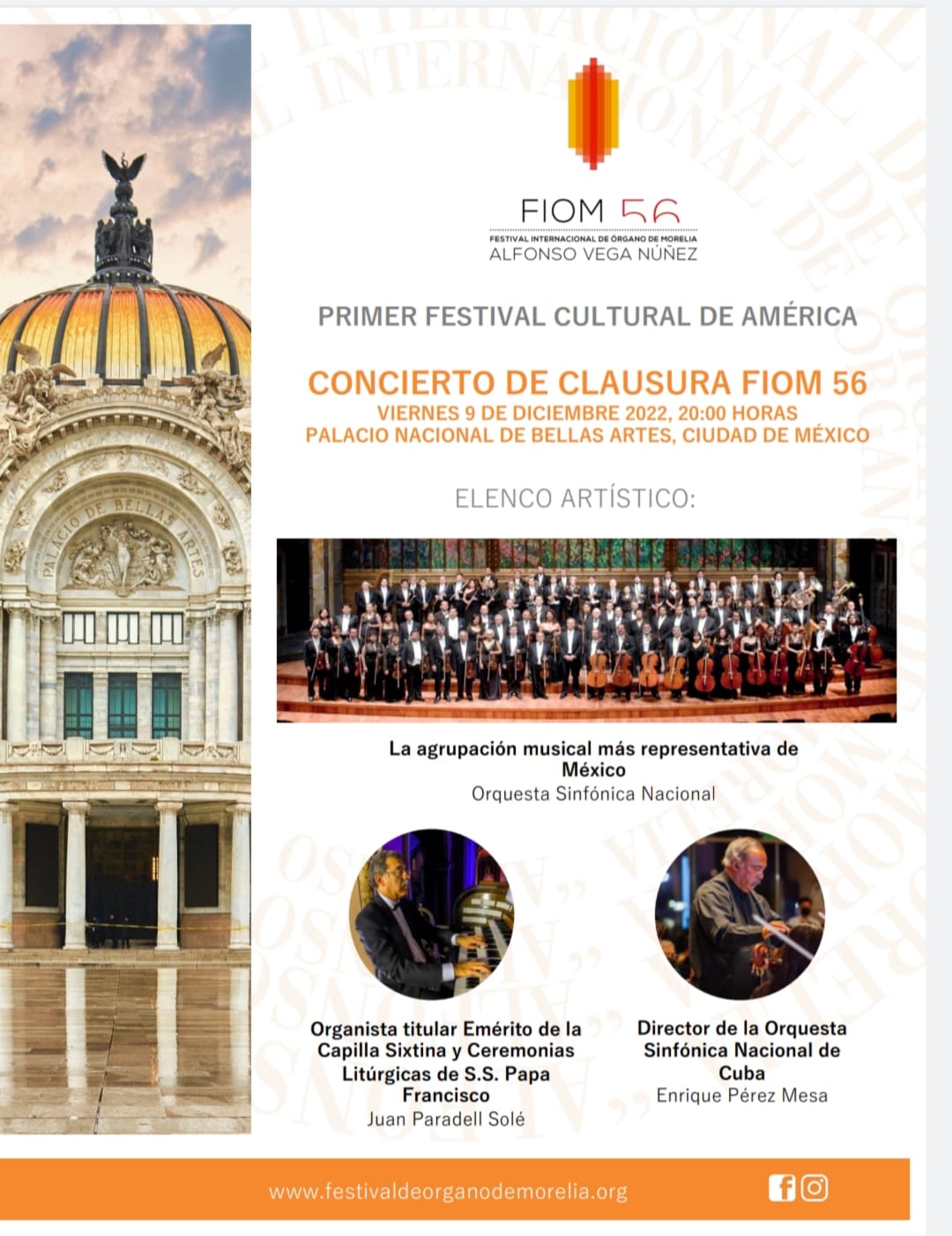 Este viernes, la Ciudad de México recibe al Festival Internacional de Órgano de Morelia en el majestuoso Palacio de Bellas Artes y con esta presentación termina la quincuagésima sexta edición del Festival Internacional de Órgano de Morelia, considerado como el más importante de su ramo en el mundo.