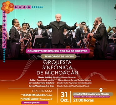 La titular de la dependencia, Tamara Sosa Alanís, infirmó que será el maestro Enrique Arturo Diemecke, quien dirija ambos conciertos. El primero se llevará a cabo el 31 de octubre en la Catedral de Morelia, mientras que el 1 de noviembre se presentará en la Basílica de Nuestra Señora de la Salud, en Pátzcuaro.