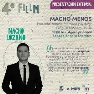 Agregó que Nacho Lozano es otro de los periodistas que estarán en esta IV Fillm, quien presentará su libro “Macho Menos”, el 27 de septiembre, a las 18:00 horas, en el Ágora Principal; además que impartirá la conferencia “Periodismo, reflexión y debate”, a las 12:00 horas del mismo día en el Salón Hotel Grand Cantalagua, actividad para la que se requiere un registro previo, el cual se puede hacer en el siguiente enlace: https://acortar.link/PjzpuG