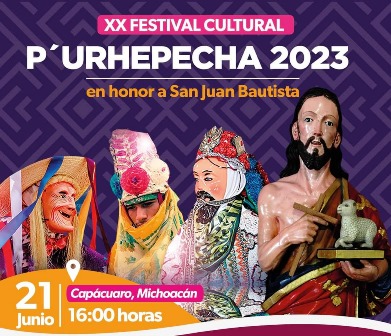 La Secretaría de Cultura de Estado (Secum) invita a las y los michoacano a disfrutar del XX Festival Cultural P’urhepecha Capacuaro 2023, en honor a San Juan Bautista, que se realizará el próximo miércoles 21 de junio en esta comunidad del municipio de Uruapan.
