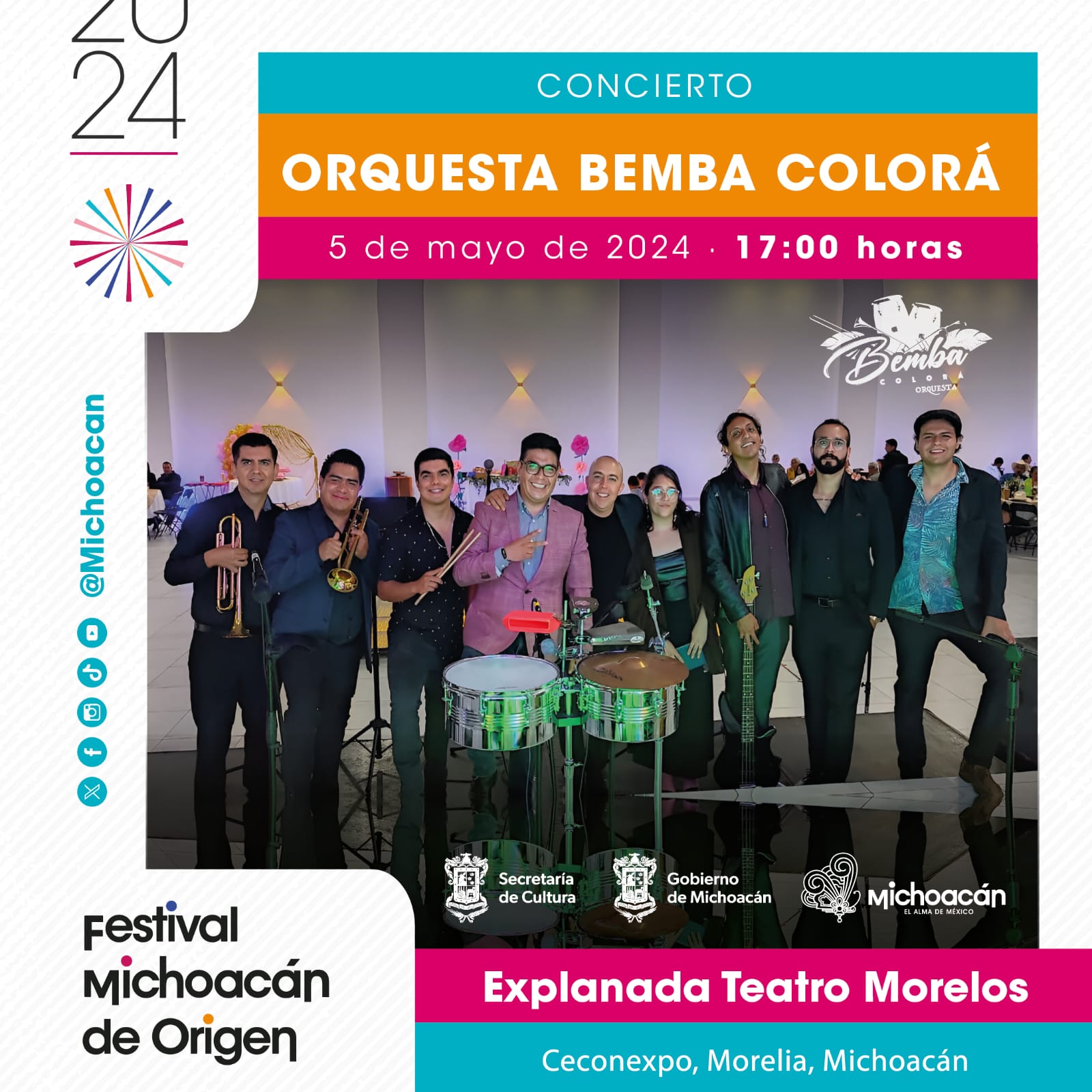 Morelia, Michoacán.- La Secretaría de Cultura de Michoacán (Secum) te invita este domingo a escoger tu pareja favorita y bailar al ritmo de la Orquesta Bemba Colorá en el Festival Michoacán de Origen. La cita es en punto de las 17:00 horas en la explanada del Teatro Morelos.
