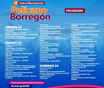 Todas las actividades serán con acceso gratuito y estarán dirigidas a todo público. Para conocer más acerca del 12° Festival Biocultural del Pelícano Borregón, los interesados pueden consultar el siguiente link: http://bit.ly/3lwTKDi.