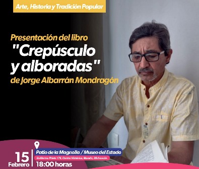 La Secretaría de Cultura de Michoacán (Secum) invita a la presentación del libro «Crepúsculo y alboradas» (2022) del escritor Jorge Albarrán Mondragón, como parte de los miércoles de Arte, Historia y Tradición Popular del Museo del Estado de Michoacán (MEM), el próximo 15 de febrero.
