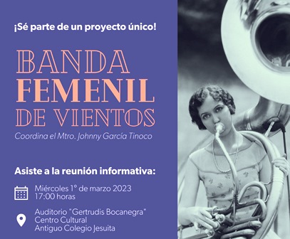 En el marco del Día Internacional de la Mujer, la Secretaría de Cultura de Michoacán (Secum), a través del Centro Cultural Antiguo Colegio Jesuita, invita a la reunión informativa para ser parte de la Banda Femenil de Vientos, coordinada por el maestro Johnny García Tinoco.