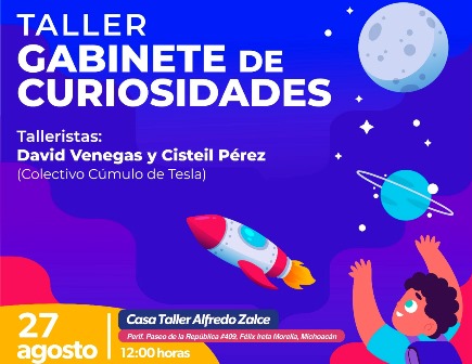 Crear una colección de objetos singular y contar una historia, es el objetivo del taller literario “Gabinete de curiosidades”, que la Secretaría de Cultura de Michoacán (Secum) ofrecerá a niñas y niños entre los 6 y 12 años en la Casa Taller Alfredo Zalce los sábados 27 de agosto, 3, 10 y 17 de septiembre, de 12:00 a 13:00 horas, con acceso gratuito.