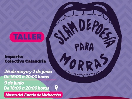 Con la finalidad de fomentar la poesía para mujeres y por mujeres, la Secretaría de Cultura de Michoacán (Secum) invita a inscribirse al taller de Slam de poesía para morras, a iniciarse el próximo 26 de mayo, en las instalaciones del Museo del Estado.