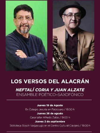 Entre el mundo sonoro de las palabras de una manera libre sobre la figura del alacrán y el aliento intenso del saxofón en el jazz, Juan Alzate y Neftalí Coria han encontrado la libertad de la improvisación, se formaliza un encuentro entre dos entidades que fueron hechas con la libertad de la creación poética como una sola orquestación.