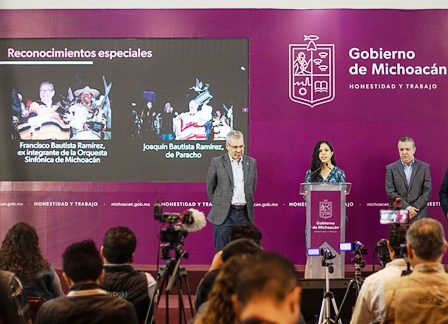 En rueda de prensa encabezada por el gobernador Alfredo Ramírez Bedolla, la secretaria de Cultura de Michoacán, Tamara Sosa Alanís, informó que la entrega de este reconocimiento es un ejercicio que realizó la institución con las y los directores de las agrupaciones de la Fiesta de Michoacán mediante mesas de trabajo, donde se determinó de forma democrática a las personas ganadoras.