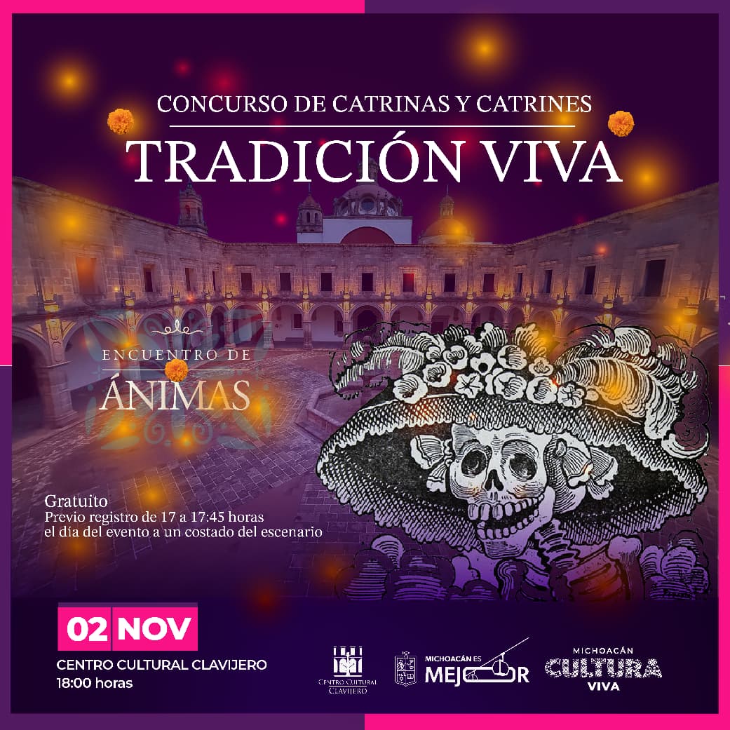 Morelia, Michoacán.- Como parte de las actividades del Encuentro de Ánimas 2025, la Secretaría de Cultura de Michoacán (Secum) invita a participar en el Concurso de Catrinas y Catrines “Tradición Viva”, que se realizará este domingo en el Centro Cultural Clavijero.