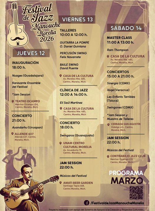 La inauguración de la edición 2026 se llevará a cabo en el Teatro Ocampo el 12 de marzo del presente año. El Festival de Jazz Manouche Morelia surge desde la comunidad de músicos en la capital michoacana en el año 2021, como una propuesta que se suma a la variedad artística de la ciudad y año con año ha ofrecido actividades para el enriquecimiento estético y lúdico de la población moreliana.