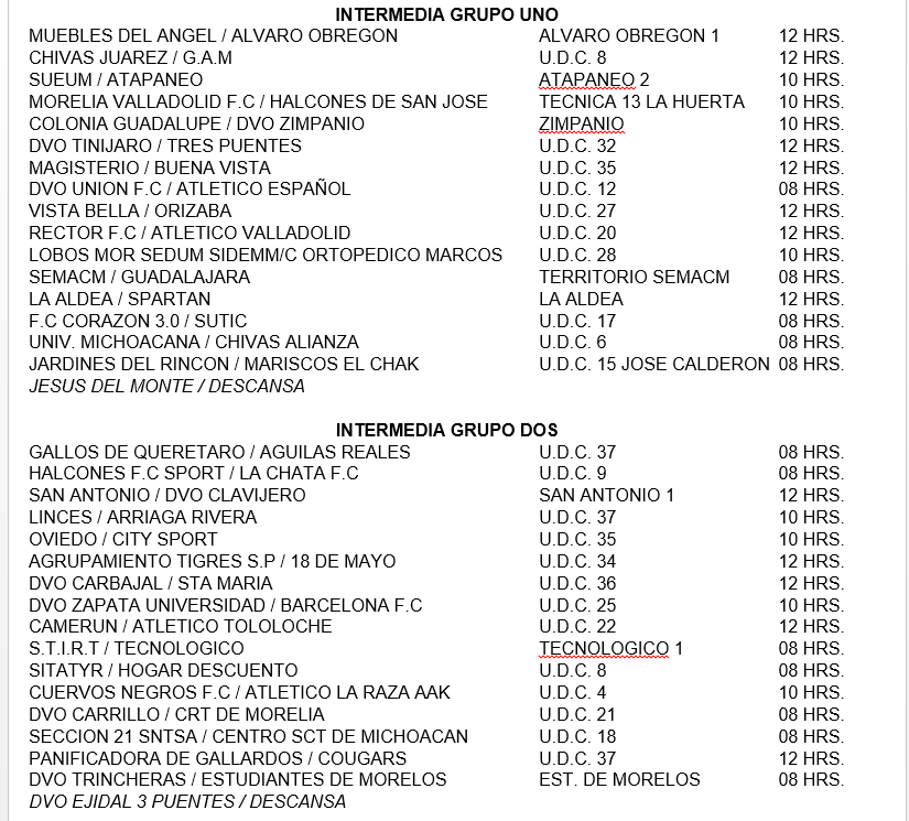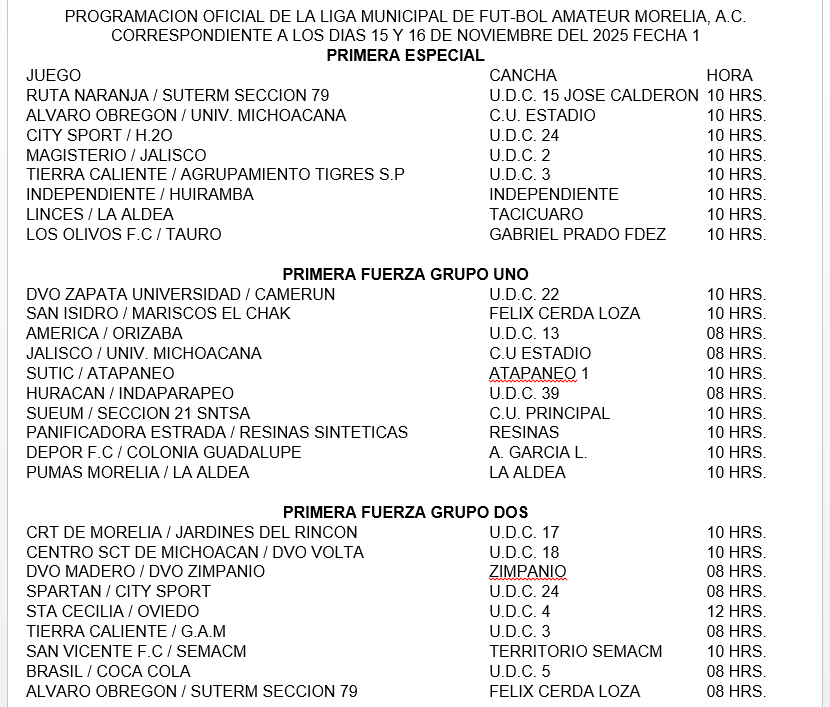 PROGRAMACION OFICIAL DE LA LIGA MUNICIPAL DE FUT-BOL AMATEUR MORELIA Deportes 14 de noviembre de 2025 Especial Respuesta Cuota FacebookTwitterWhatsAppEmailTelegram Noticias Recientes SEGURIDAD Hombre encuentra muerto a su hijo adolescente, en vivienda de Acalpican Artemio Nava - 15 de noviembre de 2025 Morelia Inaugura Yankel Benítez 10a Feria del Molcajete de San Nicolás Obispo Artemio Nava - 15 de noviembre de 2025 Deportes Atlético Morelia-UMSNH Femenil se afianza en el subliderato del Grupo 5 de la Liga TDP Artemio Nava - 15 de noviembre de 2025 Educación Más fomento a la lectura, una de las herramientas del Plan Michoacán por la Paz y la Justicia: SEE Artemio Nava - 15 de noviembre de 2025 NOTAS PRINCIPALES Habrá voto de castigo en 2027: tío de Carlos Manzo exige a Harfuch presente asesinos intelectuales Artemio Nava - 15 de noviembre de 2025 Educación Estudiantes Cecytem logran galardón de excelencia en Torneo Estatal de Robótica Artemio Nava - 15 de noviembre de 2025 SEGURIDAD Derrape de moto deja 2 muertos en Villas del Pedregal Artemio Nava - 15 de noviembre de 2025 Estado SSP separará a elemento policial que agredió a periodista e iniciará investigación Artemio Nava - 15 de noviembre de 2025 SEGURIDAD Fallece huésped del Auto Hotel El Cairo, ubicado en Morelia Artemio Nava - 15 de noviembre de 2025 SEGURIDAD Motociclista muere al accidentarse en una brecha Artemio Nava - 15 de noviembre de 2025 Noticias Relacionadas Estado Protesta pacífica termina con dos periodistas golpeadas por la policía y 3 detenidos 15 de noviembre de 2025 SEGURIDAD Hombre encuentra muerto a su hijo adolescente, en vivienda de Acalpican 15 de noviembre de 2025 Morelia Inaugura Yankel Benítez 10a Feria del Molcajete de San Nicolás Obispo 15 de noviembre de 2025 Deportes Atlético Morelia-UMSNH Femenil se afianza en el subliderato del Grupo 5 de la Liga TDP 15 de noviembre de 2025