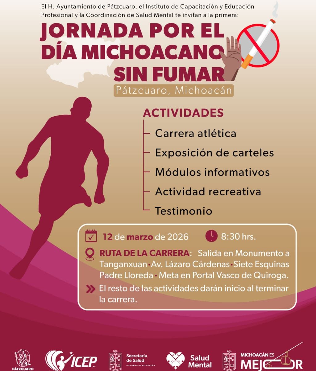 Pátzcuaro, Mich.- Con el objetivo de fomentar entornos libres de humo y proteger la salud juvenil, la Secretaría de Salud de Michoacán (SSM), a través de la Coordinación de Salud Mental, llevará a cabo una carrera atlética. Esta actividad forma parte de la jornada integral por el Día Michoacano sin Fumar, realizada en coordinación con el Ayuntamiento de Pátzcuaro y el Instituto de Capacitación y Educación Profesional (ICEP).