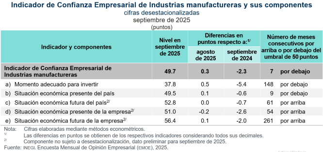 En septiembre de 2025 y con cifras desestacionalizadas, el IGOEC —que es el promedio ponderado de los indicadores de los cuatro sectores que lo integran— fue de 49.4 puntos y representó un alza de 0.1 punto en relación con el mes anterior. En su comparación anual disminuyó 1.6 puntos. Con esta última observación, el indicador suma siete meses seguidos por debajo del umbral de los 50 puntos.