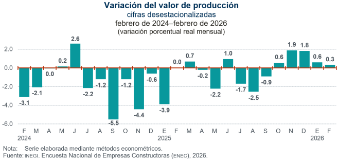 En febrero de 2026 y con datos desestacionalizados, el valor de producción del sector Construcción incrementó, en términos reales, 0.3 % a tasa mensual y disminuyó 0.8 % a tasa anual.