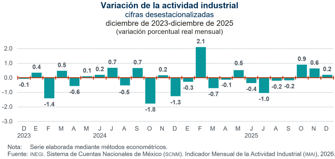 En diciembre de 2025, con cifras desestacionalizadas, la actividad industrial creció 0.2 % respecto al mes previo, en términos reales. A tasa anual incrementó 1.5 por ciento.
