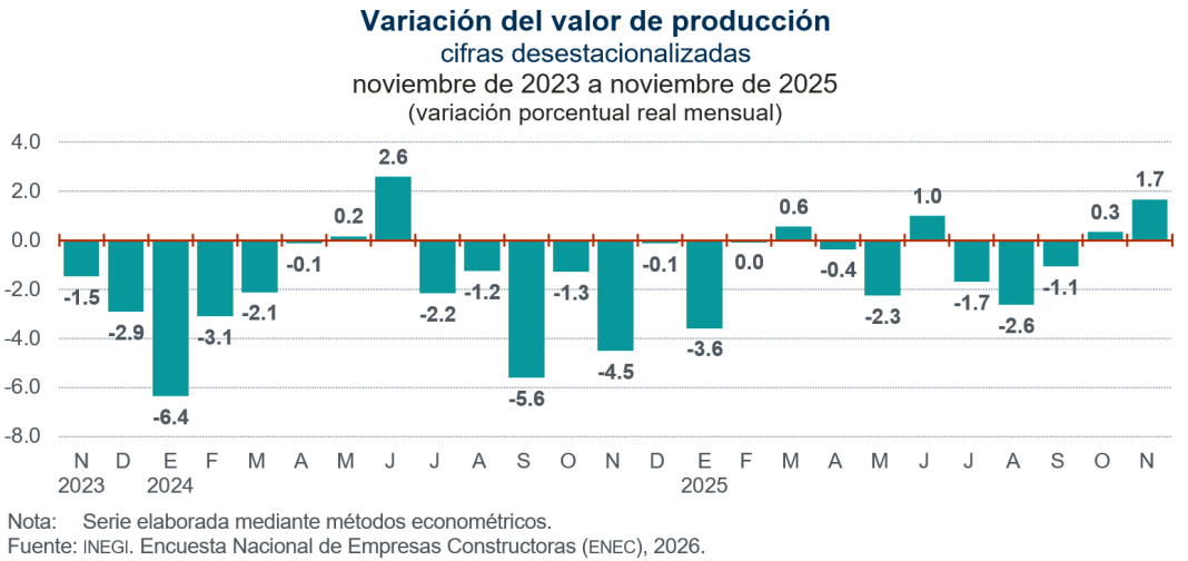 En noviembre de 2025 y con datos desestacionalizados, el valor de producción del sector Construcción incrementó, en términos reales, 1.7 % a tasa mensual y disminuyó 8.0 % a tasa anual.