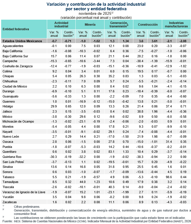 En noviembre de 2025 y con cifras desestacionalizadas, la actividad industrial registró los mayores incrementos en Hidalgo, Quintana Roo, Veracruz, Nuevo León, Chiapas y Aguascalientes respecto al mes previo, en términos reales.