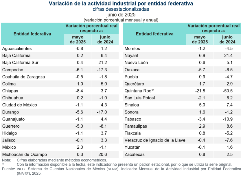 En junio de 2025 y con cifras desestacionalizadas, la actividad industrial registró los mayores incrementos en Nayarit y Sinaloa. Siguieron Tamaulipas, estado de México, Querétaro, Sonora y Colima, con respecto al mes previo, en términos reales.