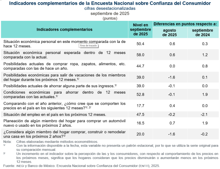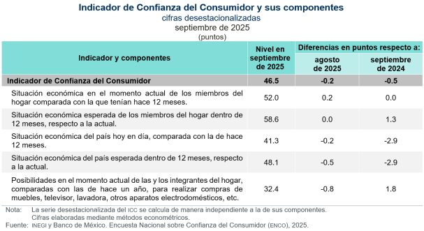 El Instituto Nacional de Estadística y Geografía (INEGI) y el Banco de México dan a conocer el ICC de septiembre de 2025. Con datos ajustados por estacionalidad, el ICC se ubicó en 46.5 puntos, lo que implicó una reducción mensual de 0.2 puntos.