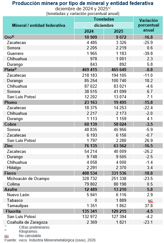La producción minera (la que refiere únicamente a las actividades de extracción y beneficio de minerales metálicos y no metálicos) presentó, en diciembre de 2025, los siguientes resultados por entidad federativa: