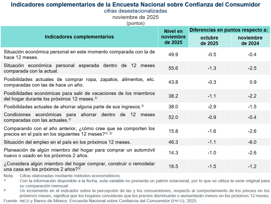 A continuación, se presentan los 10 indicadores complementarios sobre la confianza del consumidor que recaba la ENCO.