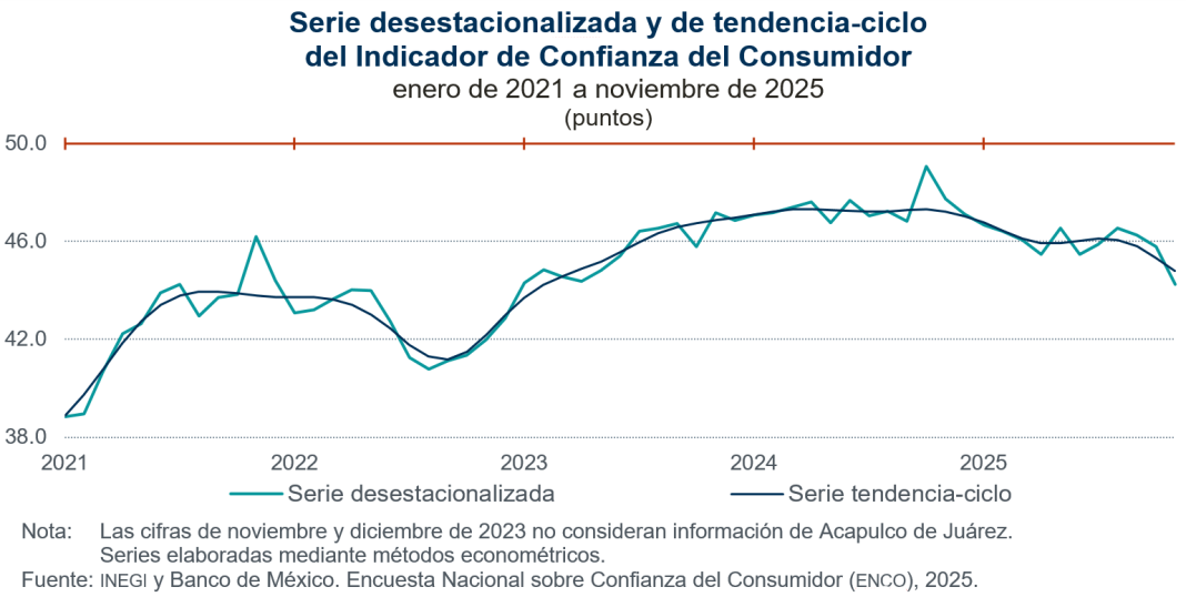 El Instituto Nacional de Estadística y Geografía (INEGI) y el Banco de México dan a conocer el ICC de noviembre de 2025. Con datos ajustados por estacionalidad, el ICC se ubicó en 44.2 puntos, lo que implicó una caída mensual de 1.6 puntos.