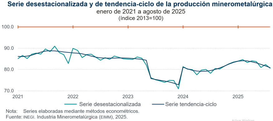 En agosto de 2025, la producción minerometalúrgica del país (actividades de extracción, beneficio, fundición y afinación de minerales metálicos y no metálicos) decreció 2.1 % a tasa mensual y aumentó 0.2 %, a tasa anual, con cifras desestacionalizadas.
