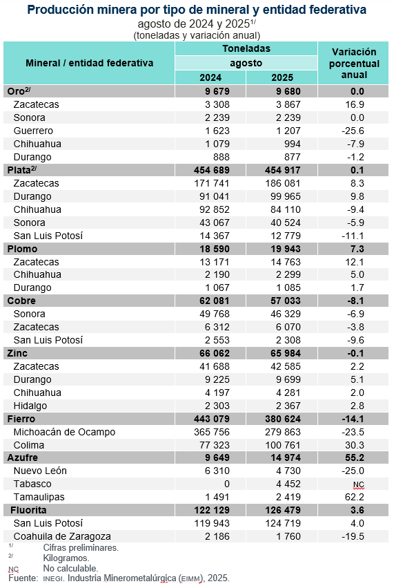 La producción minera (la que refiere únicamente a las actividades de extracción y beneficio de minerales metálicos y no metálicos) presentó, en agosto de 2025, los siguientes resultados por entidad federativa: