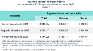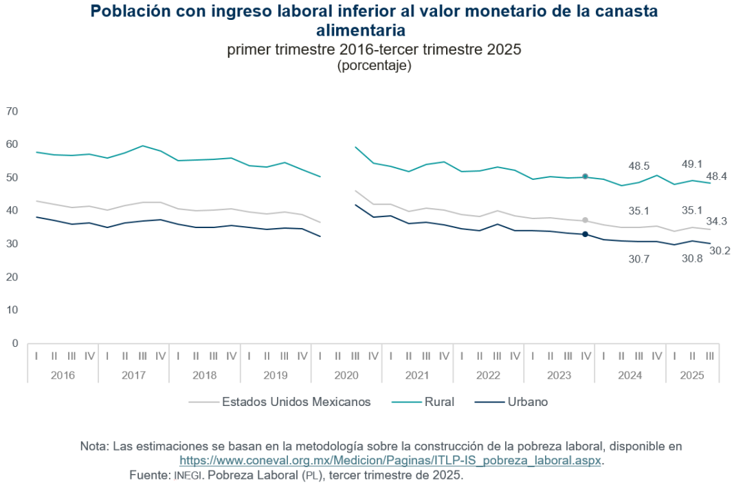 Entre el tercer trimestre de 2024 y el tercer trimestre de 2025, el porcentaje de población en pobreza laboral (cuyo ingreso laboral per cápita es inferior a las Líneas de Pobreza Extrema por Ingreso (LPEI), según el ámbito rural o urbano) disminuyó 0.8 puntos porcentuales a nivel nacional: pasó de 35.1 a 34.3 por ciento. En el ámbito rural, disminuyó 0.1 puntos porcentuales: pasó de 48.5 a 48.4 por ciento. Por su parte, en el ámbito urbano disminuyó 0.5 puntos porcentuales al pasar de 30.7 a 30.2 %. En el ámbito nacional, la diferencia trimestral de la pobreza laboral respecto al segundo trimestre de 2025 fue de -0.8 puntos porcentuales: pasó de 35.1 a 34.3 por ciento. Para los ámbitos rural y urbano, la disminución en el mismo periodo fue de 0.7 y 0.6 puntos porcentuales, respectivamente.