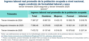 Respecto a la situación de formalidad laboral, en el tercer trimestre de 2025, la población ocupada formal reportó un ingreso laboral mensual de 10 mil 573.62 pesos; y la población ocupada informal, de 5 mil 237.34 pesos. El ingreso laboral real mensual de la población ocupada formal presentó una disminución anual de 0.1 %, mientras que el ingreso de la población ocupada informal creció 4.4 por ciento. En cuanto a la variación trimestral, el ingreso de la población ocupada formal e informal disminuyó 2.3 y 0.4 %, respectivamente.