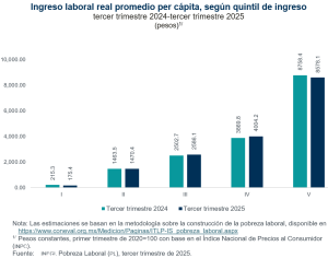 En cuanto al ingreso laboral real per cápita, en 21 de las 32 entidades federativas se registró un aumento anual (tercer trimestre de 2024 y 2025). Los tres mayores incrementos se dieron en Sonora (12.2 %), Querétaro (9.5 %) y Jalisco (7.8 %). Las entidades con mayor decremento del ingreso laboral en este periodo fueron San Luis Potosí (13.3 %), el estado de México (8.6 %) y Veracruz (6.7 %). En la variación trimestral, 17 de las 32 entidades federativas registraron un incremento. Los aumentos más pronunciados se observaron en Querétaro (7.8 %), Chiapas (7.2 %) y Nayarit (6.4 %), mientras que las principales reducciones del ingreso laboral se presentaron en Ciudad de México (10.5 %), Chihuahua (9.1 %) y Sinaloa (8 %).