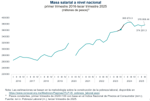Entre el tercer trimestre de 2024 y el mismo trimestre de 2025, la masa salarial real —que es la suma total de los ingresos laborales de las personas ocupadas— disminuyó 2.3 %: pasó de 385 mil 672.30 a 376 mil 859.44 millones de pesos. Lo anterior representó una disminución de 8 mil 812.86 millones de pesos en este periodo. La variación trimestral incrementó 0.7 por ciento.
