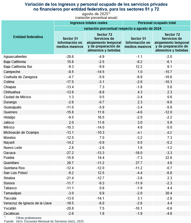 El siguiente cuadro destaca los resultados de sectores económicos presentes en cada una de las entidades federativas. Estos se refieren al sector 51, Servicios de información en medios masivos, así como al 72, Servicios de alojamiento temporal y de preparación de alimentos y bebidas (se trata de los sectores que más participan en la variable de ingresos en las 32 entidades federativas).
