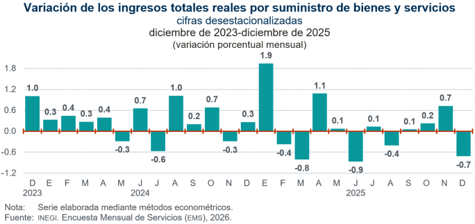 En diciembre de 2025, con cifras desestacionalizadas, los ingresos totales reales por suministro de bienes y servicios de los servicios privados no financieros descendieron 0.7 % respecto al mes previo.