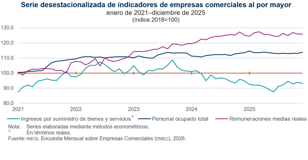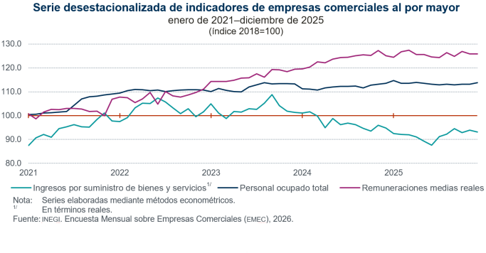 En diciembre de 2025, a tasa mensual y con datos desestacionalizados, los ingresos reales por suministro de bienes y servicios (monto que se obtuvo por todas aquellas actividades de producción, comercialización o prestación de servicios) de las empresas comerciales al por mayor descendieron 0.8 por ciento. El personal ocupado total aumentó 0.6 % y las remuneraciones medias reales no presentaron variación.