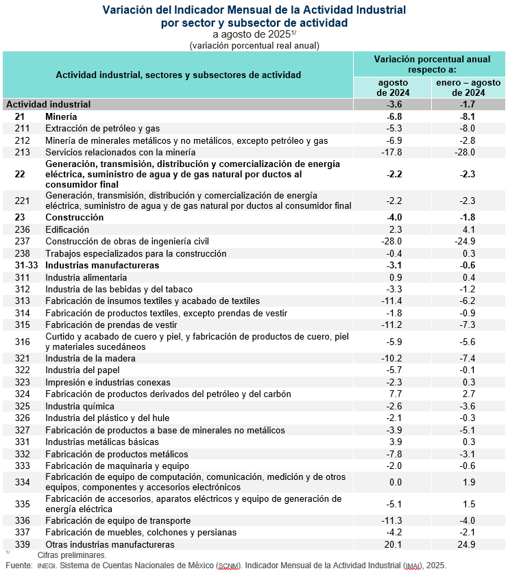 En su comparación anual, en agosto de 2025, Minería descendió 7.0 %; Construcción, 3.2 %; Generación, transmisión, distribución y comercialización de energía eléctrica, suministro de agua y de gas natural por ductos al consumidor final, 2.4 %, e Industrias manufactureras, 1.7 %.