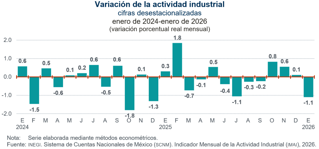 En enero de 2026, con cifras desestacionalizadas, la actividad industrial descendió 1.1 % respecto al mes previo, en términos reales.