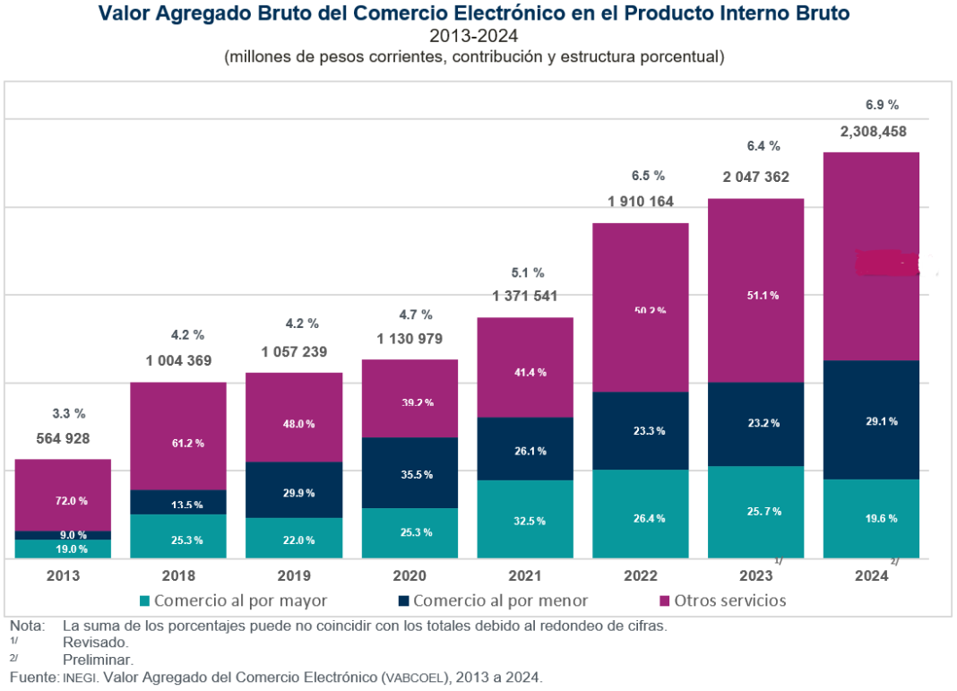 El Valor Agregado Bruto del Comercio Electrónico fue de 2 billones 308 mil 458 millones de pesos, a precios corrientes