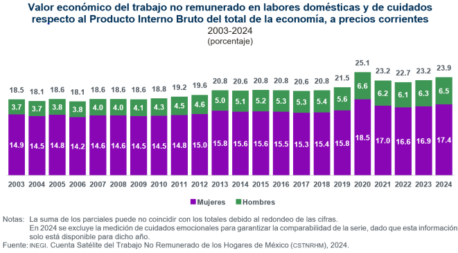 En 2024, el valor económico de las labores domésticas y de cuidados que realizó la población de 12 años y más fue de 8 billones de pesos a precios corrientes —es decir, a precios vigentes en el periodo al que se refiere la información—. Esta suma equivalió a 23.9 % del Producto Interno Bruto (PIB) del total de la economía. De ese monto, las mujeres contribuyeron con 72.6 % y los hombres, con 27.4 por ciento. En conjunto, las labores domésticas y de cuidados que realizaron las mujeres aportaron 2.7 veces más valor económico que las que desempeñaron los hombres.