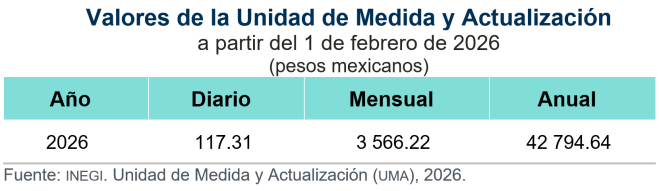 El Instituto Nacional de Estadística y Geografía (INEGI) da a conocer la actualización del valor de la Unidad de Medida y Actualización (UMA) que tendrá vigencia a partir del 1 de febrero de 2026.