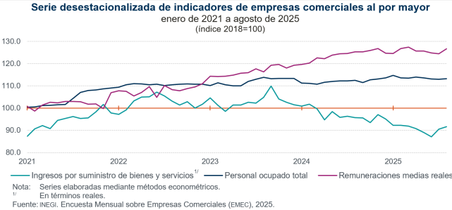 En agosto de 2025, a tasa mensual y con datos desestacionalizados, los ingresos reales por suministro de bienes y servicios (monto que se obtuvo por todas aquellas actividades de producción, comercialización o prestación de servicios) de las empresas comerciales al por mayor incrementaron 1.2 %; el personal ocupado total, 0.2 %, y las remuneraciones medias reales, 1.7 por ciento.