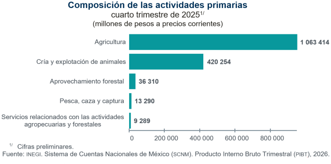 Por componente, el PIB nominal de Minería fue de 990 millones 013 mp, que equivale a 2.9 % del PIB; el de Generación, transmisión, distribución y comercialización de energía eléctrica, suministro de agua y de gas natural por ductos al consumidor final se ubicó en 505 millones 624 mp (1.5 % del PIB); el de Construcción registró 2 mil 433 millones 036 mp (7.1 % del PIB) y el de Industrias manufactureras sumó 6 mil 899 millones 296 mp, que representó 20.3 % del PIB en valores básicos, en el cuarto trimestre de 2025.