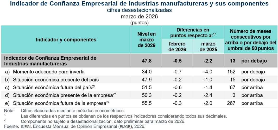 En el tercer mes de 2026 y con cifras desestacionalizadas, el ICE de Industrias manufactureras fue de 47.8 puntos, 0.5 puntos menos que en febrero pasado. Con este dato, el indicador se sitúa, por 13 meses consecutivos, por debajo del umbral de los 50 puntos. El comportamiento mensual del indicador resultó de descensos en sus cinco componentes.
