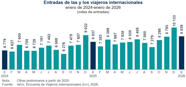 En enero de 2026 ingresaron al país 8 millones 838 mil 914 viajeras y viajeros internacionales, 10.0 % más que en el mismo mes de 2025. De esta cantidad, 4 millones 287 mil 586 (48.5 %) entraron como turistas internacionales —residentes en el extranjero que pernoctaron en México— (ingresaron 8.6 % más que en enero de 2025) y 4 millones 551 mil 328 (51.5 %) lo hicieron como excursionistas internacionales —que no pernoctaron en su viaje—.