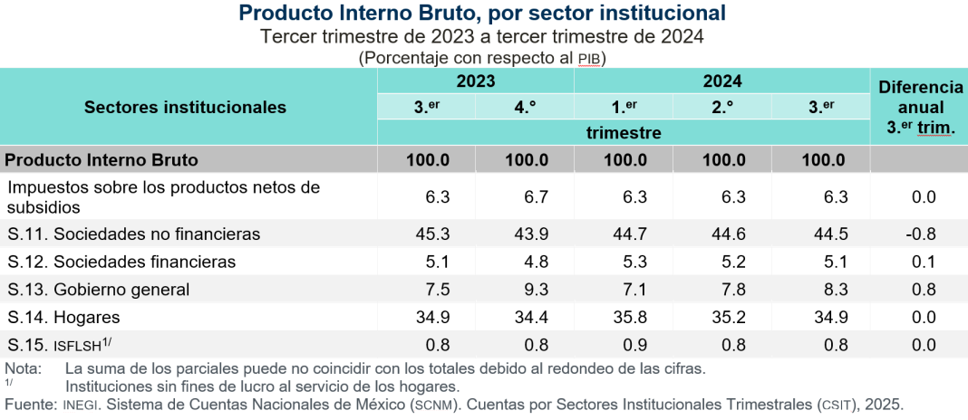 Los distintos sectores institucionales generan el PIB mediante la producción de bienes y servicios finales al interior de un país. En el tercer trimestre de 2024, el sector Sociedades no financieras participó con 44.5 % del PIB y Hogares, con 34.9 %, en conjunto generaron 79.4 % del PIB. Siguieron Gobierno general, con 8.3 %; Sociedades financieras, 5.1 % y las Instituciones sin fines de lucro al servicio de los hogares (ISFLSH), 0.8 por ciento. El restante 6.3 % se conformó por los Impuestos sobre los productos netos de subsidios.